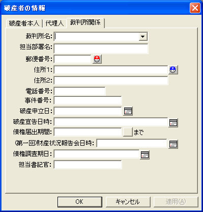 「破産者本人」の情報,「代理人」弁護士の情報,破産を申立てた「裁判所関係」が登録できます。これらの情報は,後で修正できますので,分かっている範囲で入力をしてください。